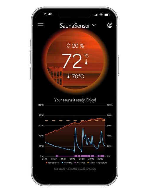 Naudodamiesi programėle galite bet kada ir iš bet kur stebėti temperatūrą, drėgmę ir naudojimą. Ji netgi apskaičiuoja įkaitimo laiką ir praneša, kada pirtis jau paruošta, kad galėtumėte užeiti pačiu tinkamiausiu momentu.
