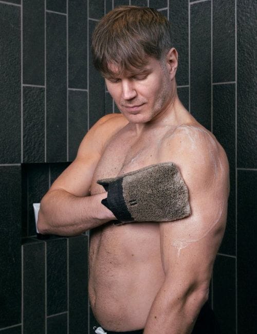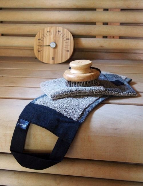 Švelniai nuvalykite pirties suminkštintą odą su linine kilpine prausimosi pirštine. Delno pusė yra dvigubai sutvirtinta.