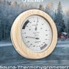 Termometras ir higrometras Fischer. Temperatūra iki 120 laipsnių, drėgmė iki 60 procentų. Matmenys – diametras 15cm. Gamintojas Fischer, Vokietija.